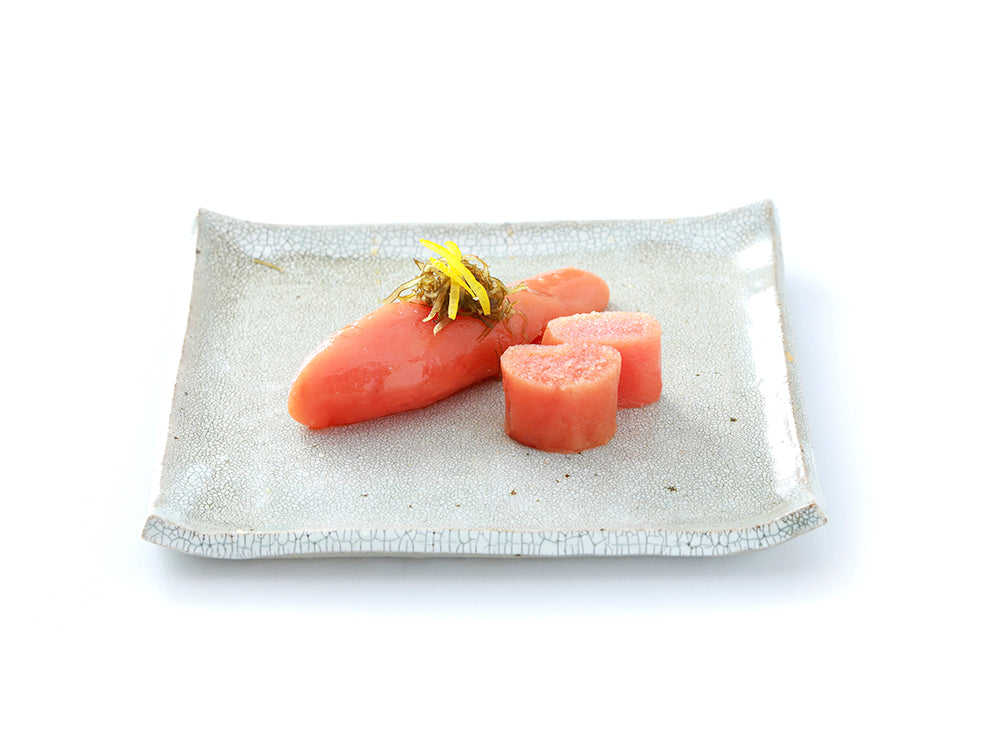 【辛子めんたいこ(柚子風味明太子)】すけとうだらの卵巣(ロシア、アメリカ)、発酵調味液、食塩、清酒、唐辛子、柚子、昆布エキス/調味料(アミノ酸等)、甘味料(ソルビット)、酸化防止剤(V.C)、ナイアシン、発色剤(亜硝酸Na)